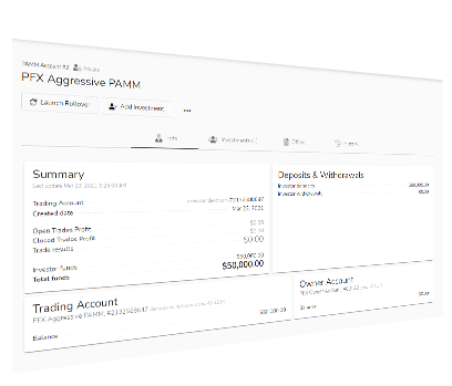 Separate automated functionality for Fund Raisers that work together with PAMM Money Manager lets you focus on trading while taking care of the administrative process in the back ground.